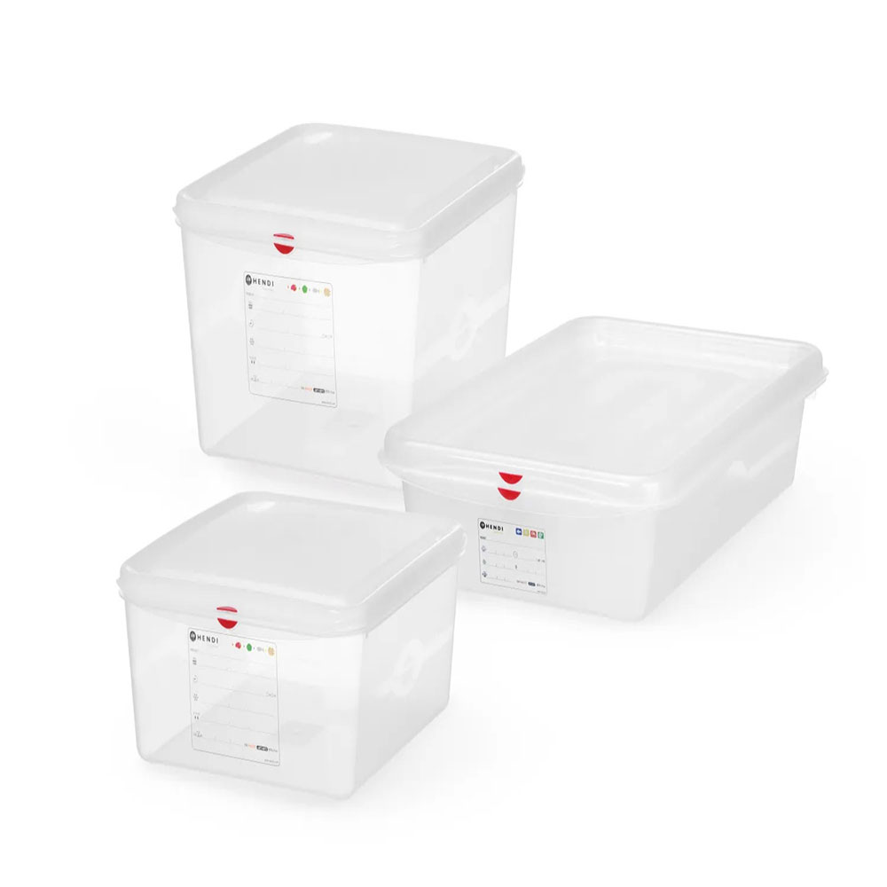 The HENDI GN polypropylene sealed food storage containers are durable and stackable with a secure, leak-resistant lid.