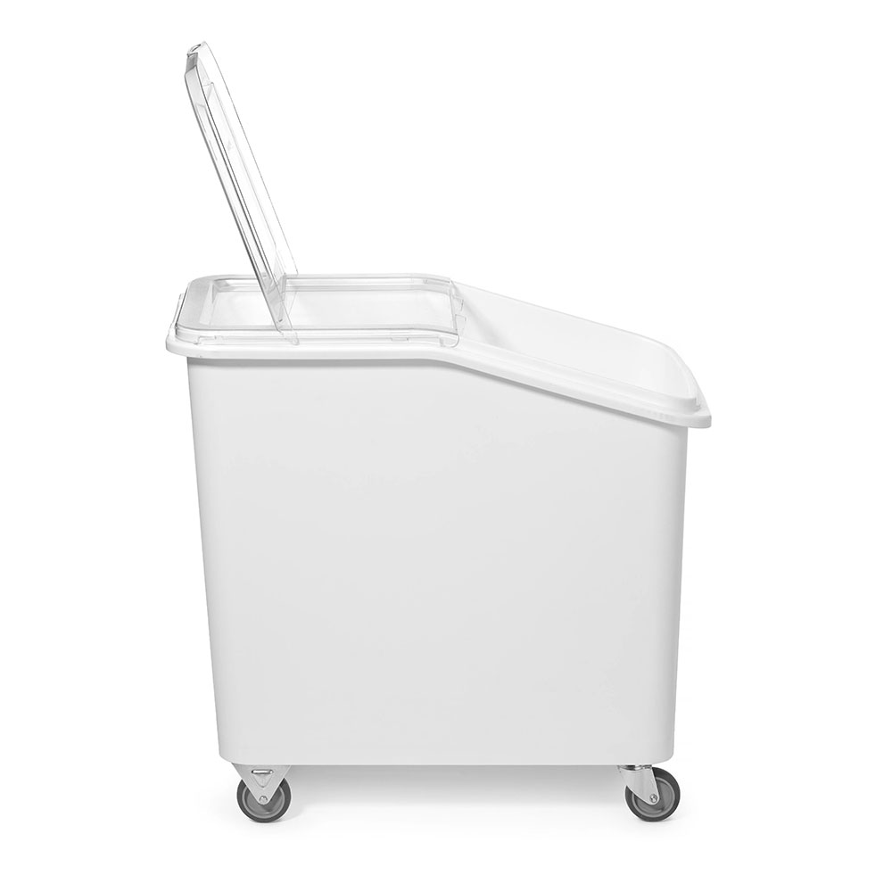 Its durable polypropylene body, transparent lid, and smooth-rolling rubber wheels ensure easy access, visibility, and effortless transport in busy kitchens.