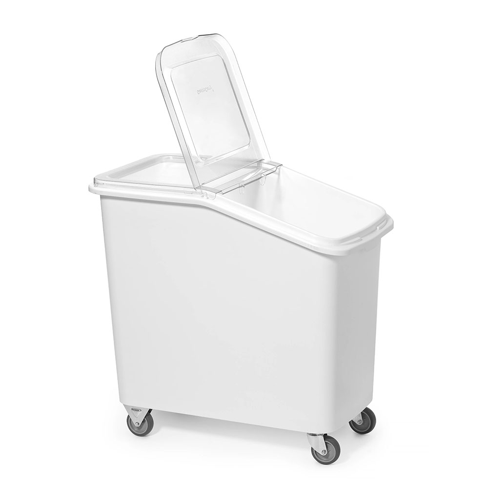 Its durable polypropylene body, transparent lid, and smooth-rolling rubber wheels ensure easy access, visibility, and effortless transport in busy kitchens.