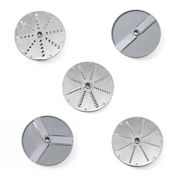 5 cutting discs included: 2 mm slices (disc with 3 blades), 4 mm slices (disc with 3 blades), 3 mm grater, 5 mm grater, 7 mm grater